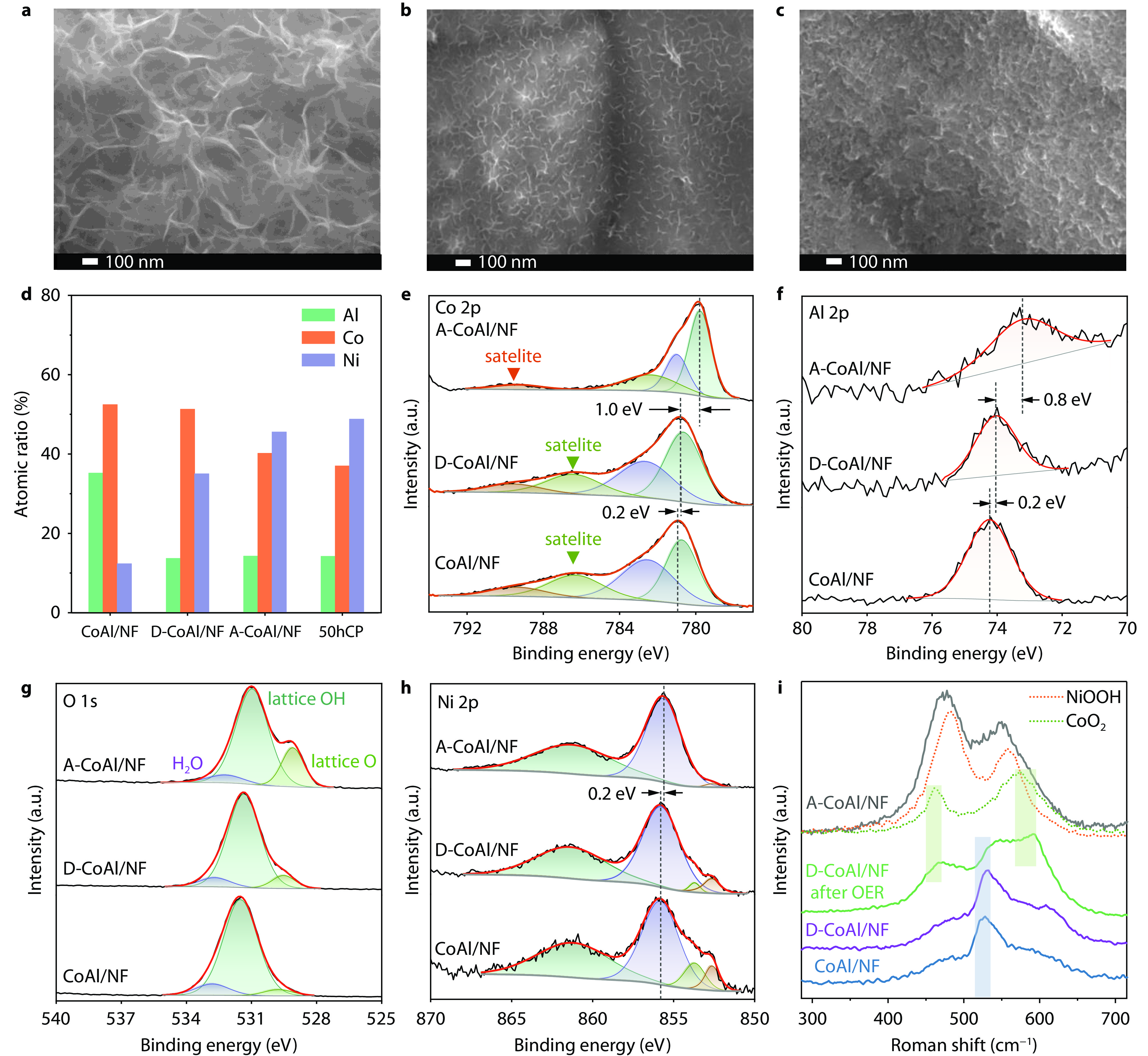 Characterization analysis of CoAl/NF, D-CoAl/NF and A-CoAl/NF. SEM images of a CoAl/NF, b D-CoAl/NF, c A-CoAl/NF. d Co, Ni, Al atomic ratio (Co at% + Ni at% + Al at% = 100%). High-resolution XPS of CoAl/NF, D-CoAl/NF and A-CoAl/NF e Co 2p, f Al 2p, g O 1s, h Ni 2p. i Ex situ Raman spectra.