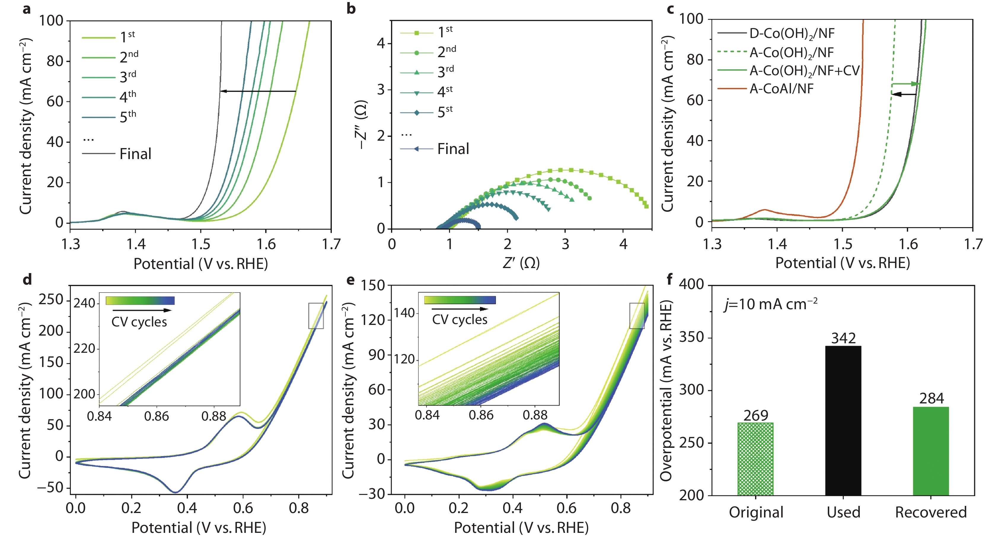 Mechanism analysis of anodic activation processes. a The evolution of polarization curves during anodic activation process. b The corresponding Nyquist plots with the LSV polarization curves in a. c Polarization curves of A-Co(OH)2/NF before and after CVs. CV curves and its zoom-in image of d A-CoAl/NF and e A-Co(OH)2/NF. f The overpotential of original, used and recovered A-CoAl/NF.