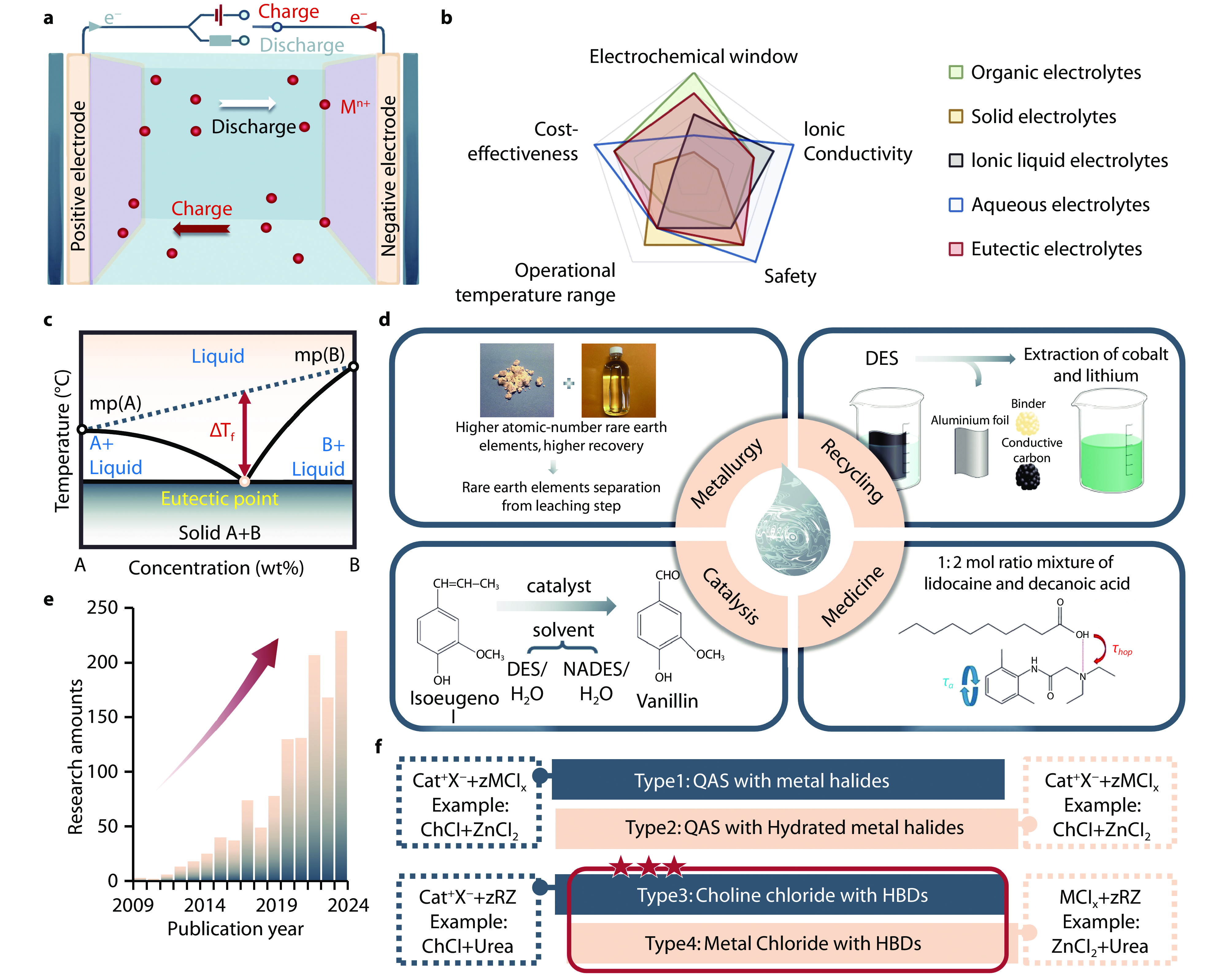 a Schematic representation of typical MIBs. b Radar plots comparing the properties of different electrolyte types. Values (distances from the center) range from 0 to 5, with 5 indicating the optimal performance for each property. c Phase diagram of eutectic electrolytes with two components. d Applications of DES. Metallurgy.[28] Copyright 2019, Chinese Society of Rare Earths. Recycling.[30] Copyright 2019, Springer Nature. Catalysis.[29] Copyright 2017, American Chemical Society. Medicine.[32] Copyright 2014, American Chemical Society. e Number of publications dealing with DEEs for batteries from 2004 to 2024. The keywords used for the search in the Web of Science were ‘deep eutectic electrolytes’. f four types of deep eutectic solvents.
