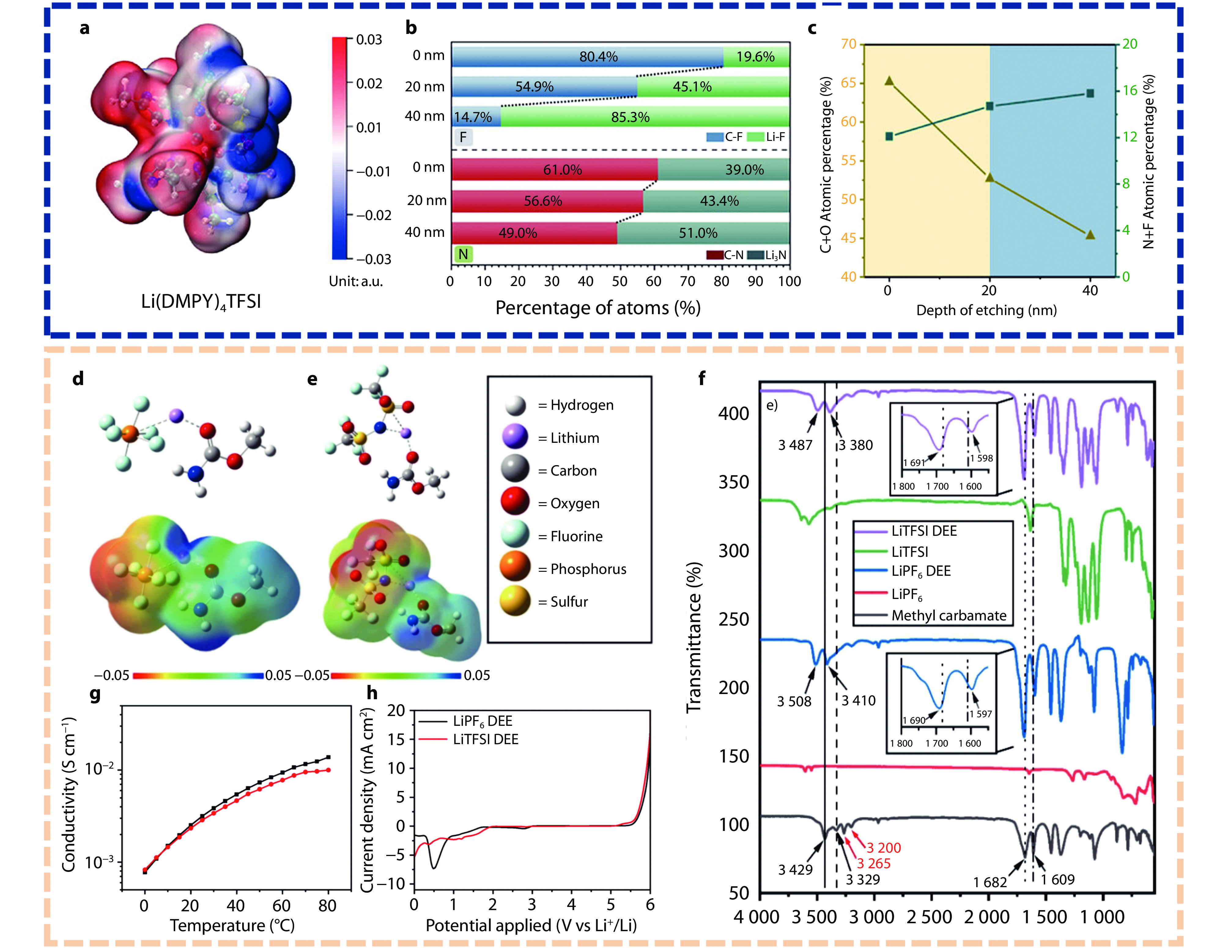 a Electrostatic potential distribution of the coordination structure in Li(DMPY)4TFSI. b The relative contents of C-F/LiF, and C-N/Li3N within the SEI layer at varying etching depths. c Quantified atomic ratios of the formed SEI at varying etching depths.[80] Copyright 2025, Wiley-VCH. Coordination environment and Molecular electrostatic potential map of d LiPF6 and methyl e LiTFSI and methylcarbamate. f FTIR of DEEs and starting materials. g ionic conductivity of DEEs at different temperatures. h cyclic voltammetry of DEEs at 25 mV/s sweep rate with Pt|Li|Li three electrode setup.[82] Copyright, 2022, Wiley-VCH.