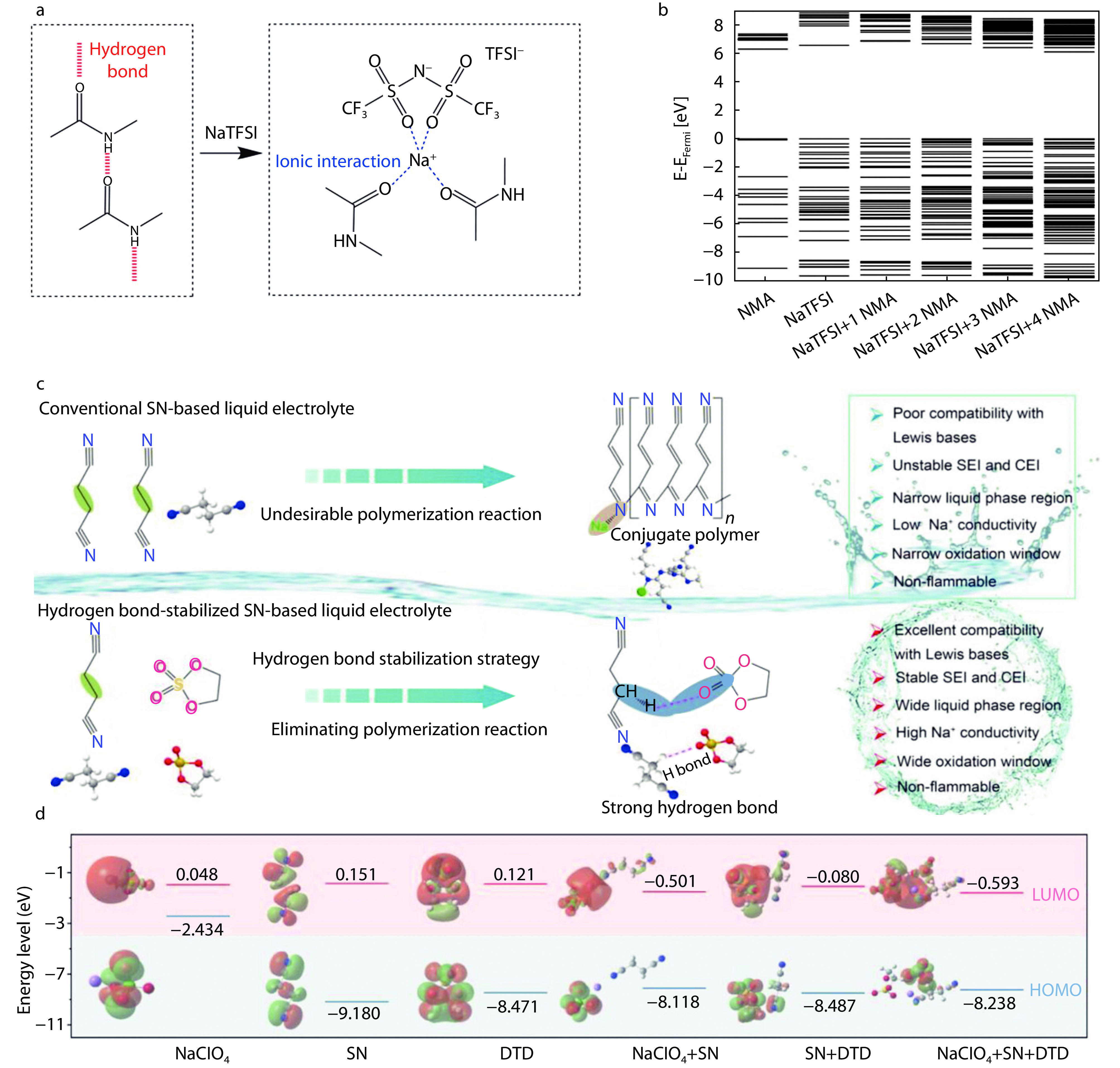 a Schematic representation of the replacement of intermolecular hydrogen bonds between NMA molecules by ionic interactions in DESs. b Electronic band structure of gas-phase molecules and clusters around the HOMO−LUMO gap. The HOMO is aligned to zero for all systems.[83] Copyright 2022, Wiley-VCH. c Schematic illustration of electrolyte design. d LUMO/HOMO values of NaClO4, SN, DTD, and their mixtures.[84] Copyright 2024, Wiley-VCH.