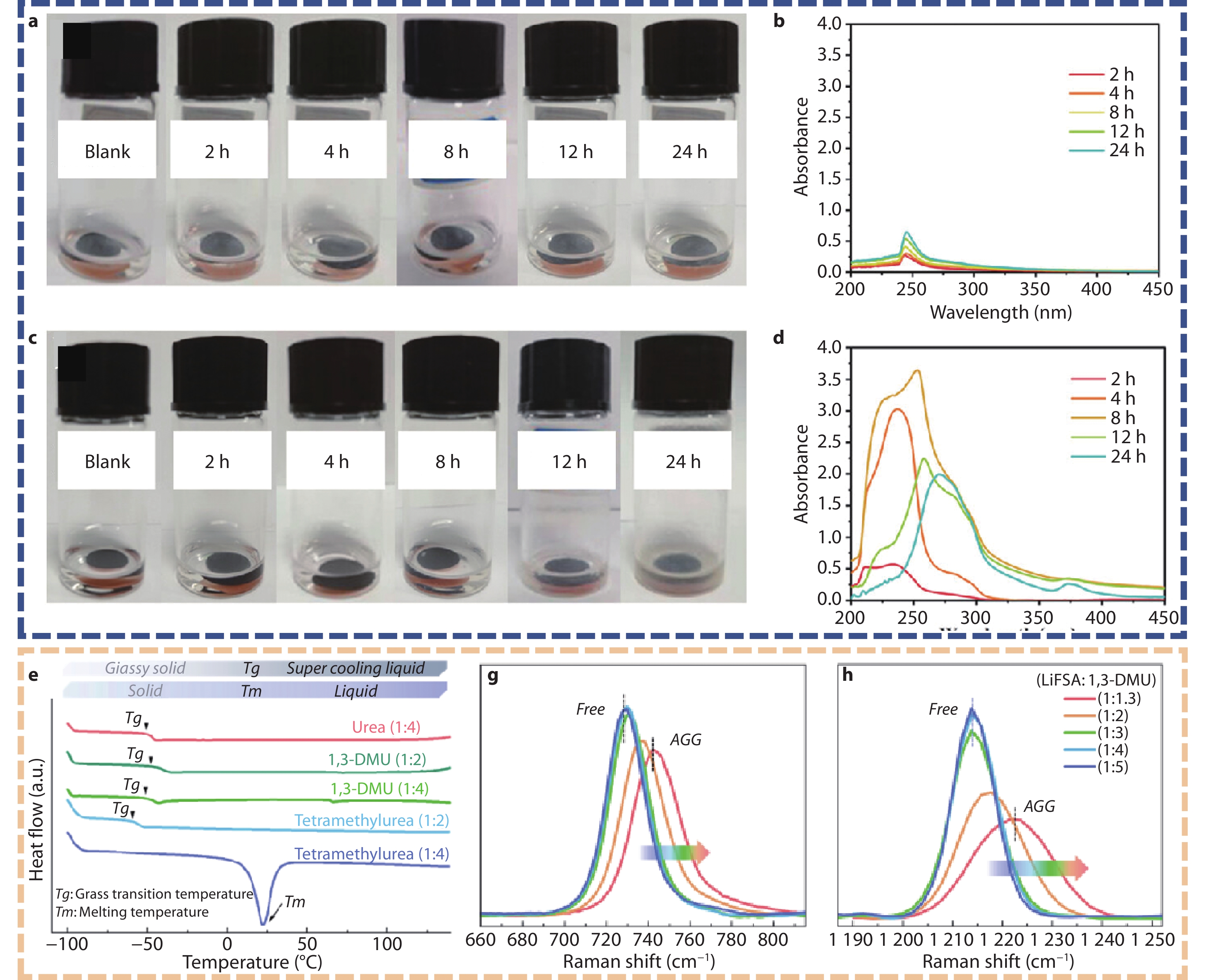 The optical images of the dissolution tests and UV spectrum characterizations of the TPA electrodes immersed in a, c DEEs and b, d in carbonate-based electrolytes for 24 h.[85] Copyright 2021, Wiley-VCH. e DSC curves during heating of our DEEs compared with concentrated electrolytes using TMU. Structure analysis of DEEs. Raman spectra of LiFSA+1,3-DMU for g S-N-S stretching mode and h S=O stretching mode regions.[81] Copyright, 2025, J-STAGE.
