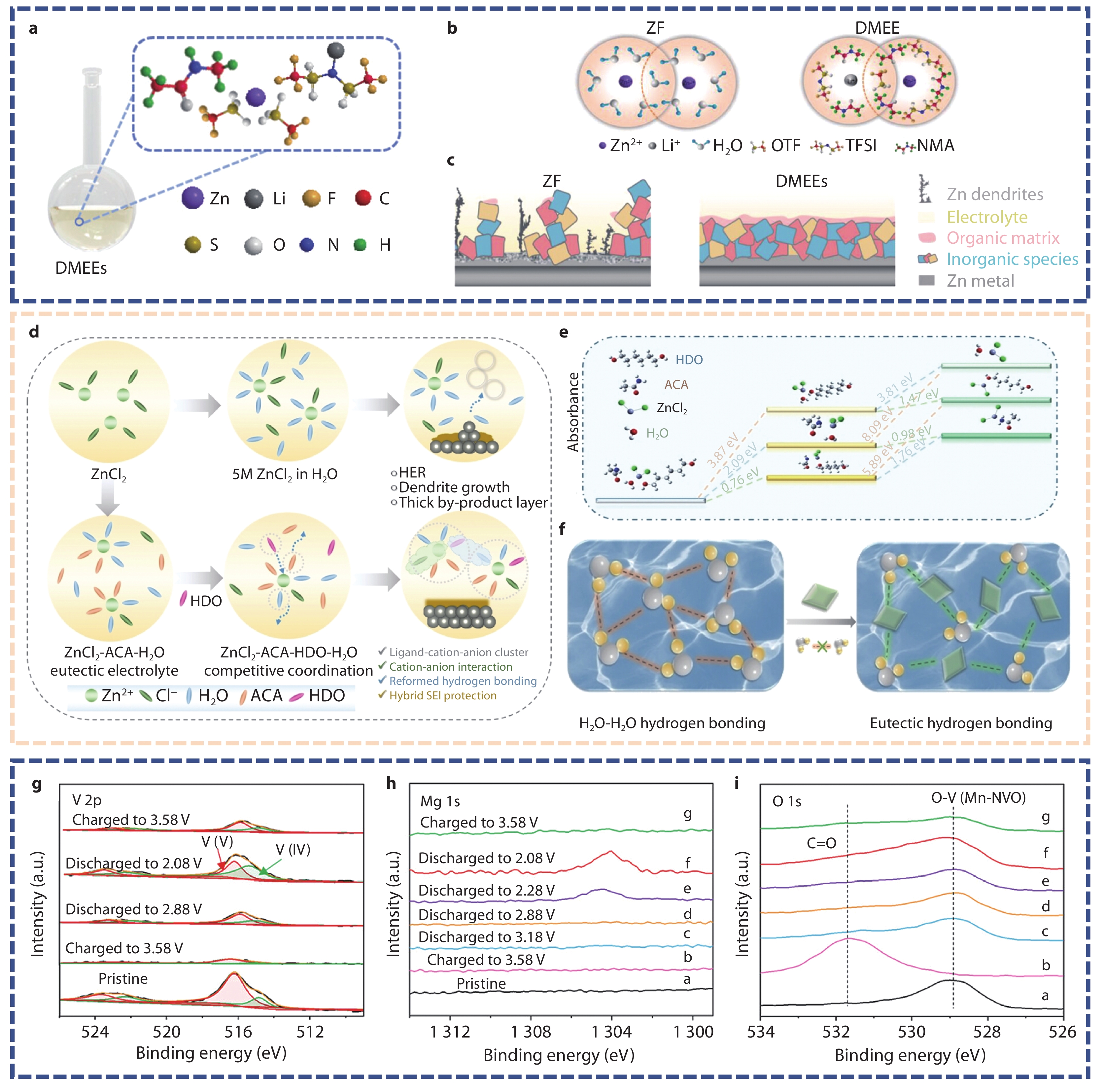 a Schematic diagram of the preparation of DMEEs. b Average Zn2+ solvation structure in ZF and DMEE. c Dendrites and side reactions on the Zn anode in ZF and SEI of Zn anode in DMEEs.[63] Copyright 2024, Wiley-VCH. d Schematic illustration. The competitive eutectic coordination chemistry. e Diagram of the energy barriers in step-by-step desolvation process. f Schematic illustration of the hydrogen bond reconstruction using competitive eutectic electrolyte.[101] Copyright 2024, Wiley-VCH. g – i High-resolution XPS spectra at V 2p, Mg 1s, and O 1s regions of the Mn-NVO electrode at different discharged/charged states.[65] Copyright 2024, American Chemical Society.